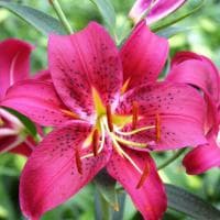 Лилия Монтесума из группы восточных гибридов удивляет садоводов своими просто огромнейшими соцветиями. Каждый раскрывшийся бутон цветка – это 27 см в обхвате! И таких цветов на одном цветоносе несколько. Лепестки Монтесумы широкие, элегантно отогнутые к стеблю. Смотришь на них – и кажется, что попадаешь в настоящий малиновый рай. Разбавлен окрас лепестков мелким темно-красным крапом.